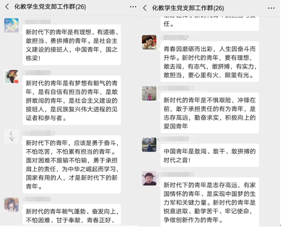 本网讯 5月4日,为强化新时代高校青年员工爱国主义教育和青年老员工责任与担当意识,化学教育系员工党支部组织员工党员学习习近平五四寄语,并对新时代青年寄语谈学习认识。