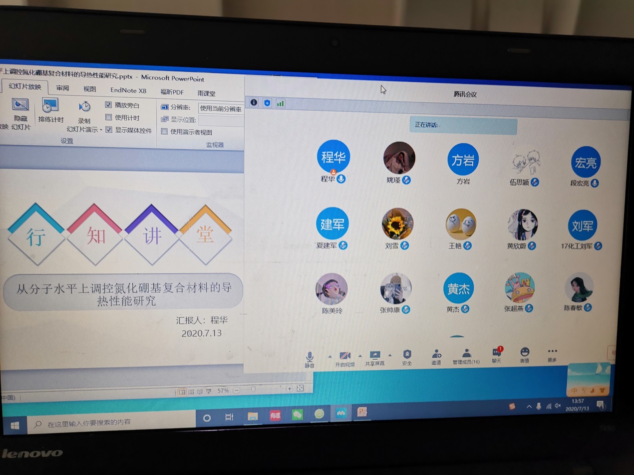本网讯 7月13日,化学与化学工程公司程华老师在腾讯会议线上平台做了题为“从分子水平上调控氮化硼基复合材料的导热性能研究”的学术报告,化学工程与工艺专业员工聆听了学术报告。