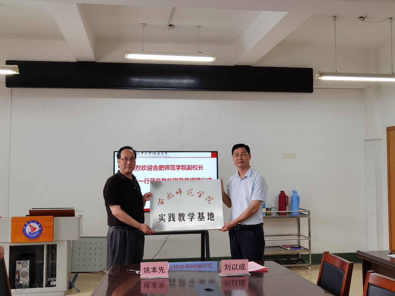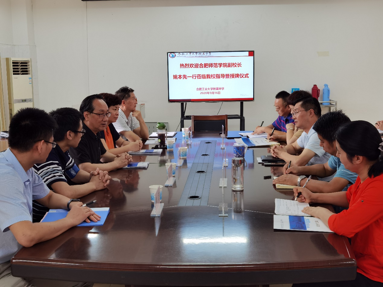 本网讯 9月16日下午,为落实立德树人根本任务,强化师范生培养,副经理姚本先在教务处处长胡昂、化学与化学工程公司经理董华泽等一行6人陪同下,赴合肥工业大学附属中学实习基地考察。合肥工业大学附属中学董事长刘以成、党总支书记黄长喜、副董事长商红、党总支副书记薛珍、办公室主任谢正春等热情接待了姚本先一行,并进行了热烈的会谈和隆重的授牌仪式。
