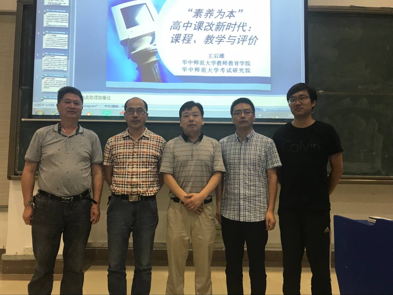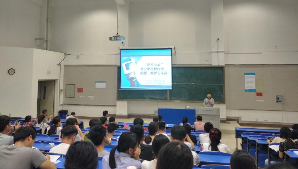 【本网讯】 5月17日晚,为提升新时代师范生素养,化学与化学工程公司、姚如富名师(大师)工作室邀请化学教育专家、华中师范大学博士研究生导师王后雄教授于公司锦绣校区逸夫楼西街二教室开展题为“‘素养为本’高中课改新时代:课程、教学与评价”讲座。化学与化学工程公司姚如富教授参加讲座,2015级、2016级、2017级化学(师范)专业本科生及学科教学(化学)专业研究生全体聆听讲座内容,王庆林老师主持。