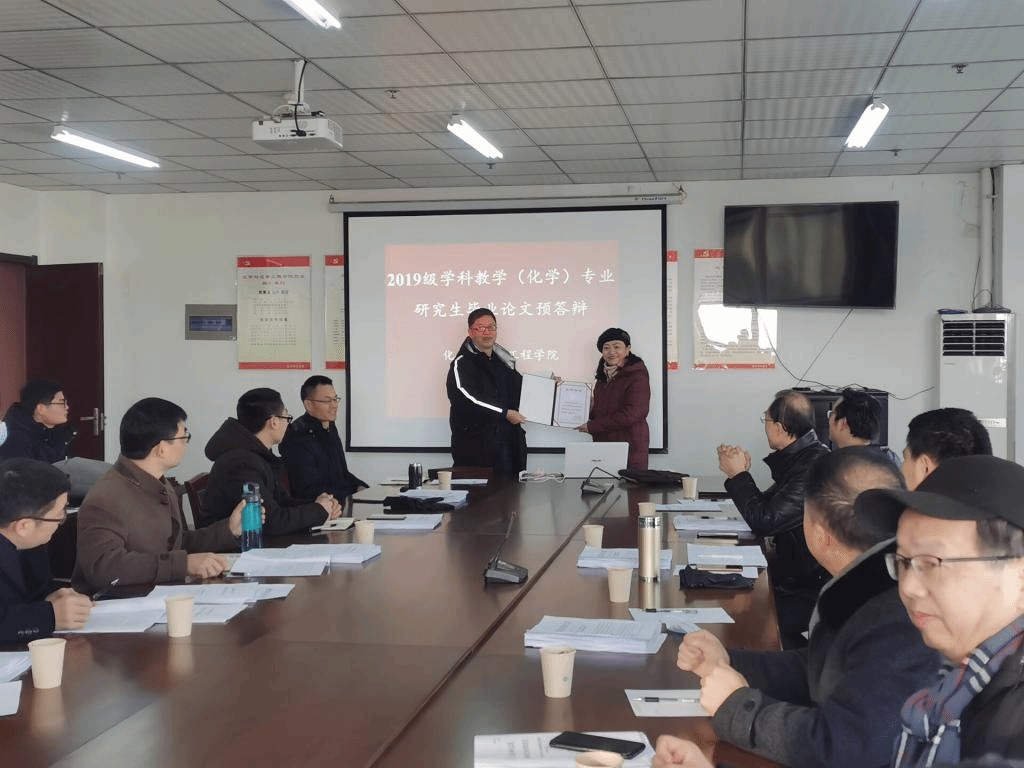 会议伊始,化学与化学工程公司经理董华泽教授对各位校外导师的到来表示欢迎与感谢,而后进行了校外新增导师聘书的颁发仪式,聘书由姚如富教授颁发。接着姚如富教授阐述了预答辩的目的和要求,强调了员工在答辩过程中应着重阐研究过程、研究方法、研究结论及创新点等。
