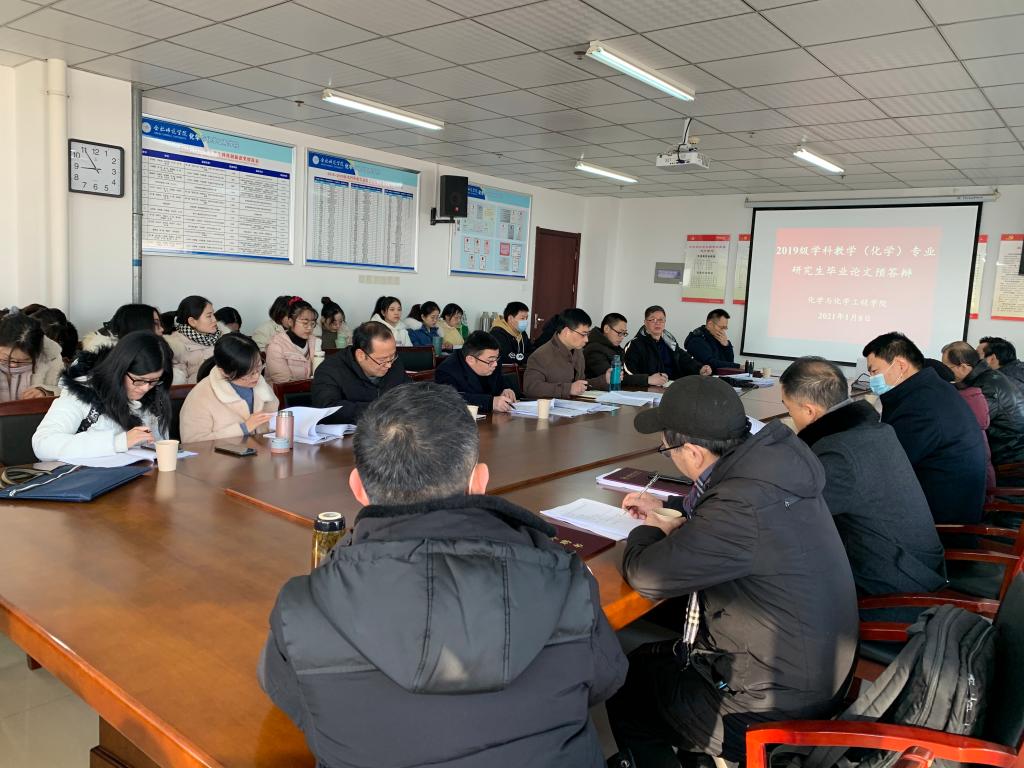 本网讯 1月8日上午8:30分,2019级学科教学(化学)全日制和2018级学科教学(化学)非全日制教育硕士专业学位论文预答辩圆满完成。此次预答辩会议分两组同时进行,一组在行知楼1402室,一组在行知楼1302室。答辩委员会主席分别由合肥市第四十六中学正高级教师江乐霄以及安徽省肥西中学正高级教师唐永担任,另外校外导师安徽省化学教研员朱成东、合肥市第四十八中董事长刘继宏、中国科学技术大学附属中学高级教师戈益超、合肥工业大学附属中学特级教师徐伟和高级教师鹿钰锋参加答辩会。全体校内导师、研究生秘书以及18级非全研究生、2019级全体研究生、2020级全体研究生参加答辩会。