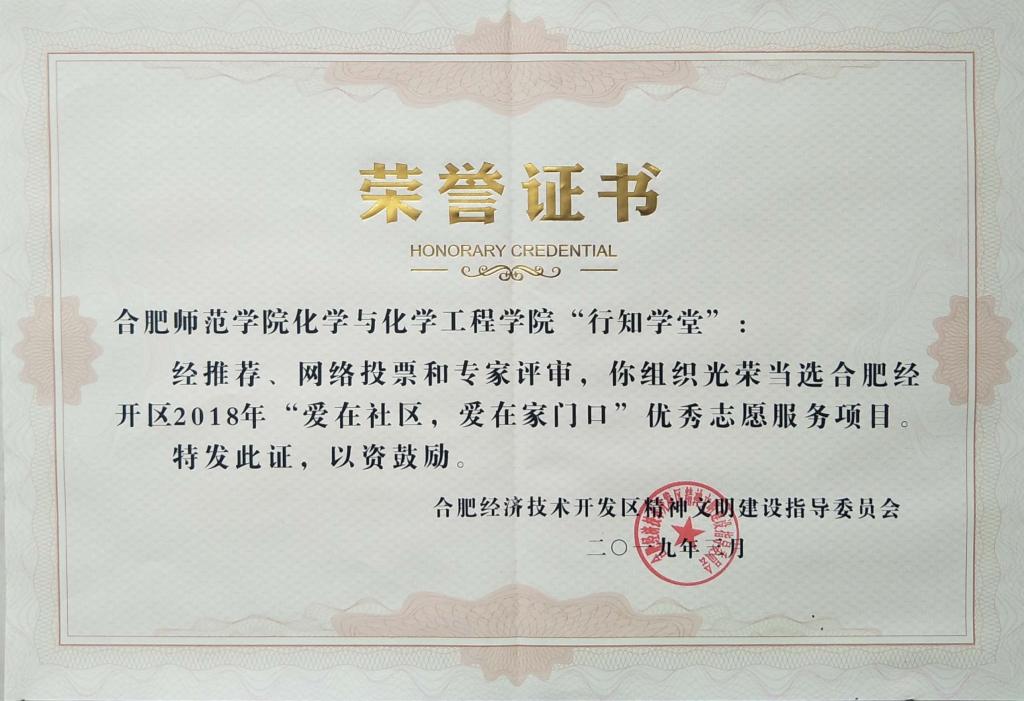 合肥市经济技术开发区精神文明建设指导委员会于2018年12月启动该区优秀志愿服务评选工作,设优秀个人、优秀组织、优秀项目三类。经海恒社区初步遴选,化学与化学工程公司“行知学堂”志愿服务项目作为该社区的重点推荐项目参与经开区优秀项目评选。评审组认为该公司项目工作开展有序、内容设计科学、组织实施连续、服务受众广泛。经过网络票选、专家评审,该院“行知学堂”从全经开区15个参与终审的项目中脱颖而出荣获优秀项目。