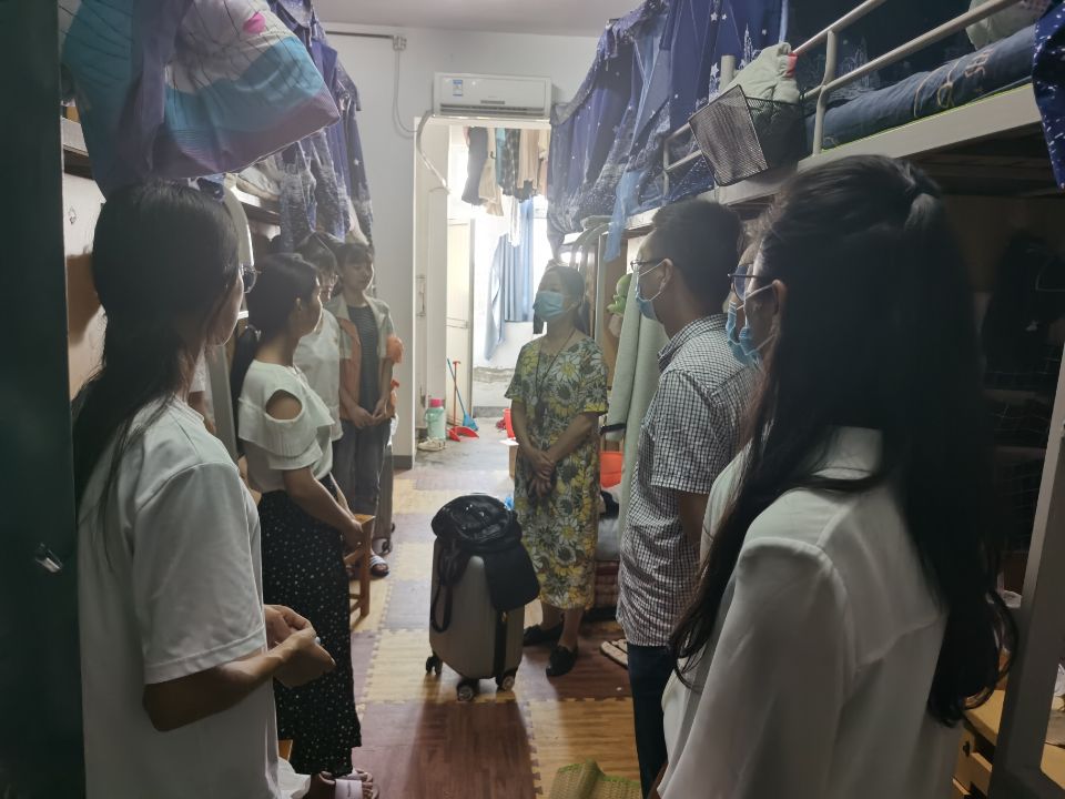 9月4日,李红、徐祝青带领辅导员张晖、王庆林、翟媛媛、原嘉清和汪颖一同走访员工宿舍。