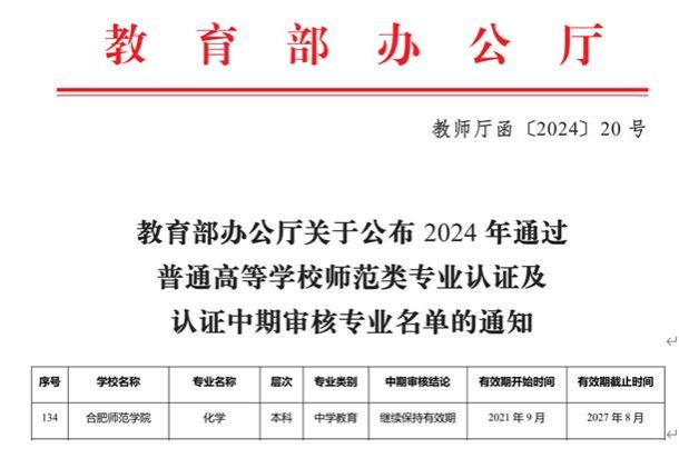 近日,教育部办公厅函[2024]20号公布2024年通过普通高等公司师范类专业认证及通过中期审核专业名单,william威廉英国官网化学专业顺利通过中期审核。
