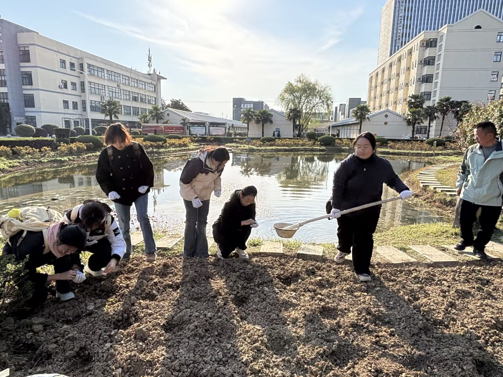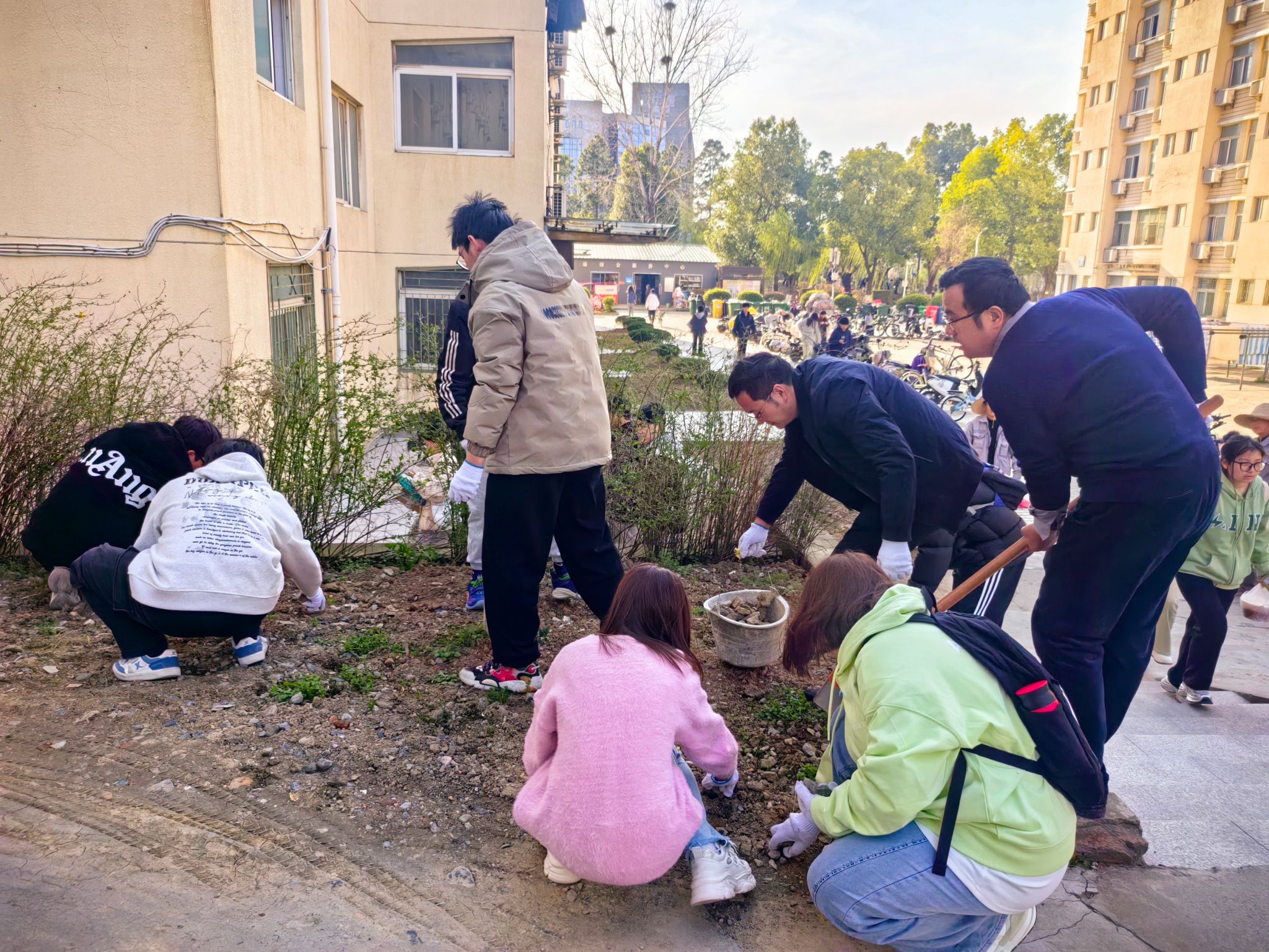 2024级同学们以班级为单位,在后勤处指导下分工合作,积极参与到员工公寓石子路铺设、柳林花田种植以及月牙湖百日红生态长廊共建等项目中。大家团结协作、分工明确,用心地捡拾碎石、细心地播种花籽、耐心地栽种苗木,在劳动实践中美化校园并培养吃苦耐劳的能力。