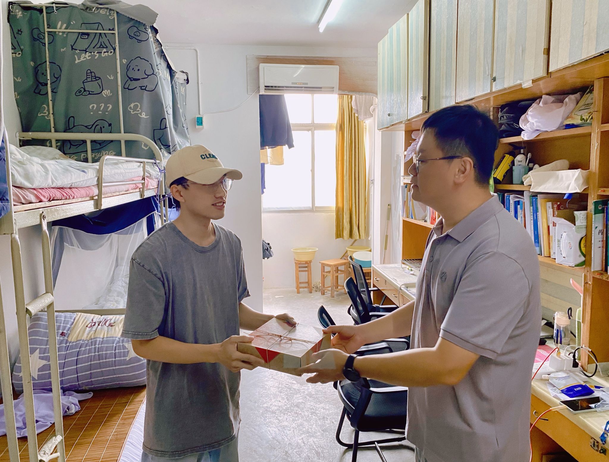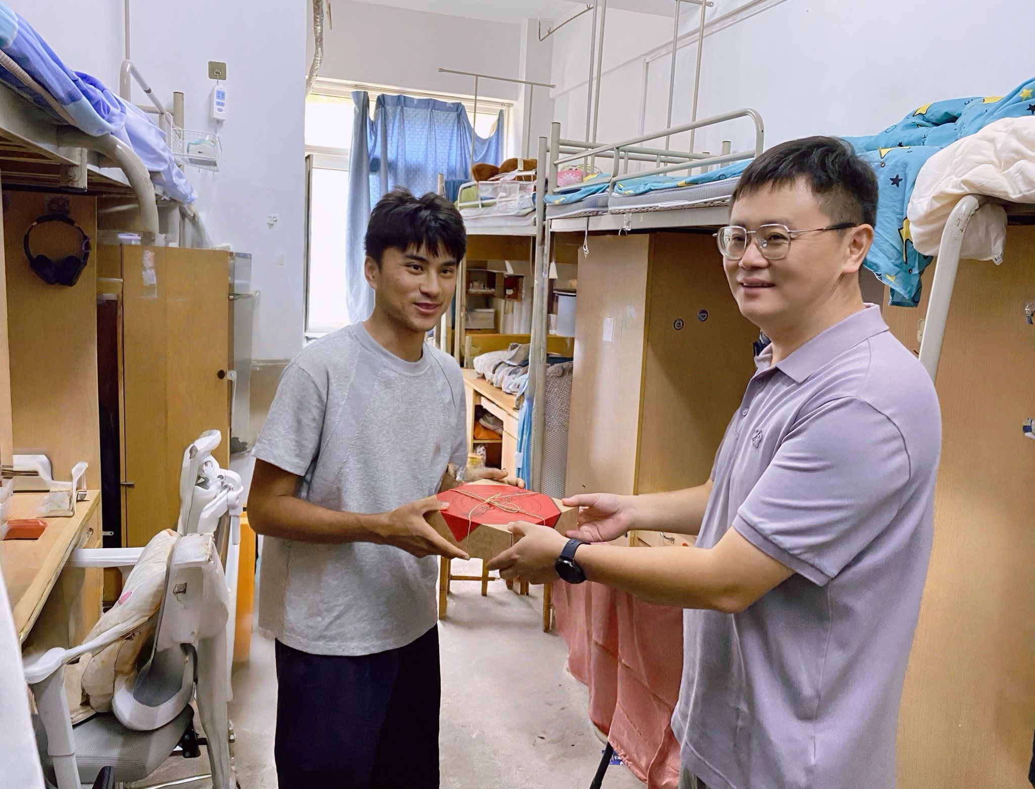 走访过程中,公司领导、老师与同学们进行了亲切交流。“家乡是哪里?”“学习生活上有没有什么困难?”“假期有什么安排?”……一句句贴心的问候,瞬间拉近了师生间的距离。每到一间宿舍,欢声笑语不断,洋溢着热烈而温馨的节日氛围。收到月饼的同学们惊喜不已,纷纷表示这份“专属”礼物让他们倍感温暖。领导们亲切关怀同学们在校的学习和生活情况,认真倾听大家的需求与建议,并叮嘱同学们在欢度假期的同时,要注意人身财产安全,合理安排作息时间,做到劳逸结合。