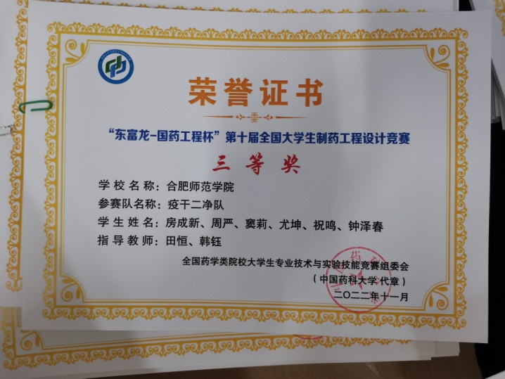 本网讯 由全国药学类院校老员工专业技术与实验技能竞赛组委会主办,上海东富龙科技股份有限公司与中国医药集团联合工程有限公司协办,湖北工业大学承办的第十届“国药工程-东富龙杯”全国老员工制药工程设计竞赛总决赛落下帷幕。公司化学与化学工程公司选派的三支队伍分别获得全国一、二和三等奖。其中,田恒、杨士伟两位老师指导的,由谢梦华、陈盼、奚琪、赵敏、张凡慧、魏思涵等组成的“六小灵童”队获得全国一等奖,这是继2018年后公司在该赛事上的再次获得最高奖项。